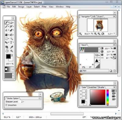 | openCanvas - программа, дающая возможность художнику новичку/продвинутому с легкостью освоить компьютерную живопись. Это небольшая по размерам программа, с интуитивно понятным интерфейсом, без лишних наворотов, однако сочетает в себе основные достоинства таких гигантов СG (Computer Graphics), как Adobe PhotoShop и Corel Painter. Имеется палитра инструментов, основные фильтры, редактор кистей, в котором можно менять форму, чувствительность, твердость кисти, удобная палитра цветов и т.д. Особенно хорошо программа сочетается с графическими планшетами, поскольку реагирует на нажатия пера и его наклон. Т.к. программа была разработана японской компанией она, в основном, является инструментом мангаков и анимешников. Однако возможности программы практически не ограничены. Рисовать в программе можно ручками, карандашами и кистями. Для нанесения краски можно использовать мастихин. Входящая в поставку библиотека разнообразных рисовальных инструментов довольно велика — с их помощью при желании можно имитировать рисование масляными и акриловыми красками, гуашью и пастелью, а также делать постерные изображения. Встроенные кисти, карандаши и ручки можно легко регулировать, причем меняя не только их размеры, степень нажима, прозрачность и т.п., но и в значительной мере форму инструмента. Пользовательские инструменты могут быть сохранены в библиотеках инструментов для дальнейшего использования. Помимо художественных инструментов, в программе имеются классические растровые, такие как штамп, палец, пятно, разнообразные затемнители и осветлители. Кроме того, существует несколько инструментов выделения, включая волшебную палочку и выделение контуров текста; реализованы обычные для растровых пакетов операции зеркального отражения, поворота, обрезки и т.п.; поддерживаются традиционные растровые фильтры, а также возможна работа со слоями, в том числе поддержка группировки слоев, регулирование их прозрачности, изменение режима слоя и подключение масок. Созданные рисунки могут сохраняться в формате программы openCanvas — OCI, а также в популярных растровых форматах JPEG и PNG. New Features of openCanvas 5: -New Pen -Free Deformation -Layer Clipping:Let you use the content of a layer to mask the layers above it -Layer Link -Snap: Help with precise placement of selection edges, cropping marquees, shapes, paths, etc.. -Flip Horizontal/Vertical -Highspeed display of high resolution image editing -Highspeed display and improvement of Brushstroke -Adding new Brush -New Layer Group function and more.. What's New in this release: -New Function / Operation changes -You can use "save as" function with a new document. -Following tools' maximum brush radius has been increased from 200pixels to 500pixels. -Pencil (ver.4 compatible, ver.3 compatible) -Eraser (ver.4 compatible, ver.3 compatible) -Watercolor (ver.4 compatible, ver.3 compatible) -Air Brush (ver.4 compatible, ver.3 compatible) -Now you can use the memory up to 4GB with 64 bits Windows Operating System. -For the below tools, we added the function to create a rectangle and ellipse from the center when you drag a cursor while holding down Ctrl. -Draw Rectangle -Draw Ellipse -Fill Rectangle -Fill Ellipse -Select Rectangle -Select Ellipse -We added the function to move a layer horizontally or perpendicularly when you drag a cursor while holding down Shift. -We added the shortcut key editing function. -We added the layer link function. *No compatibility to PSD file format Failure Correction -Malfunctioning of saving layer name in PSD format has been corrected. -Malfunctioning of preview function under "Type" and "Type Mask" tools when "Background Color" is OFF has been corrected.Some sentenses have been revised. -Malfunctioning of "delete" function in shortcut setting has been corrected. -Malfunctioning of [Alt + key] in shortcut setting has been corrected. -Malfunctioning of event file "replay" function, when you mixed with ver.4 and 5 brushes, has been corrected. -The error occured at reading the shortcut setting has been corrected. -Default shortcut key setting has been corrected. -Now you can open a saved file by double-clicking the file icon while using openCanvas. -Malfunctioning of event file "pause"function with Enter key has been corrected. -We corrected becoming dark when positioning a cursor on a sc